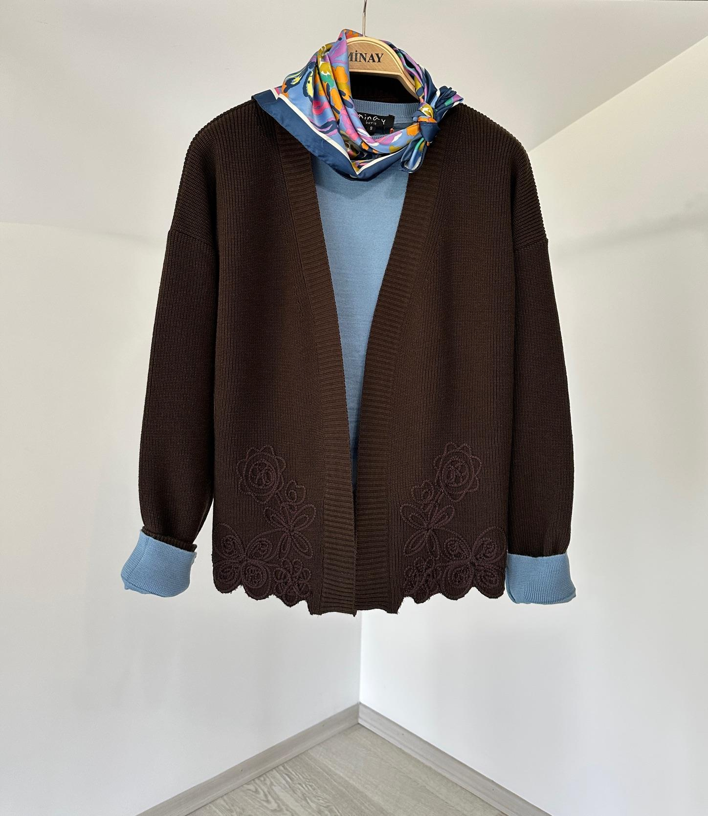 12119 Altı Nakış İşlemeli İtalyan Yün İplik Triko Hırka-Kahve