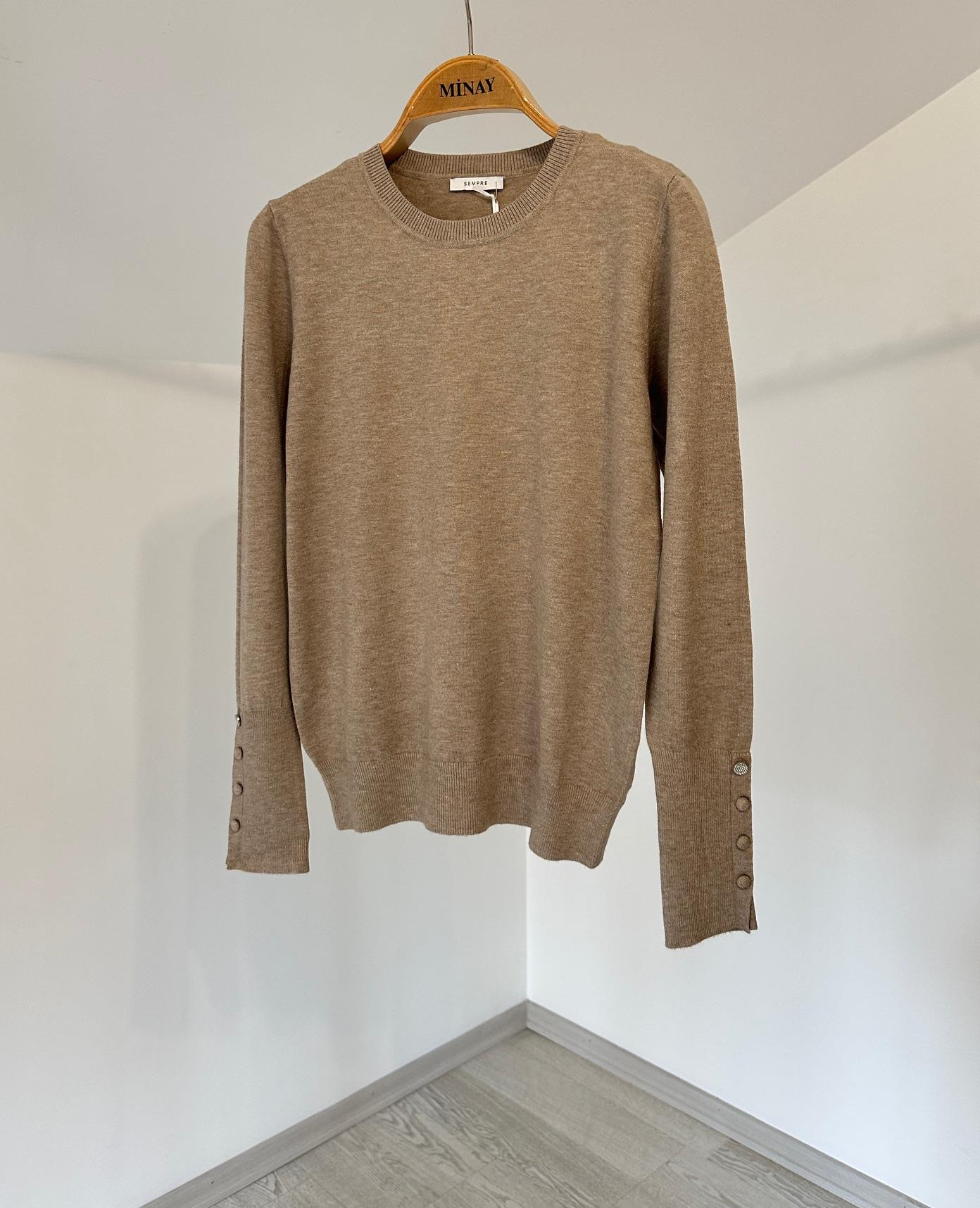 8008 Manşette Düğme Aksesuarlı Sıfır Yaka Triko Bluz-Bej