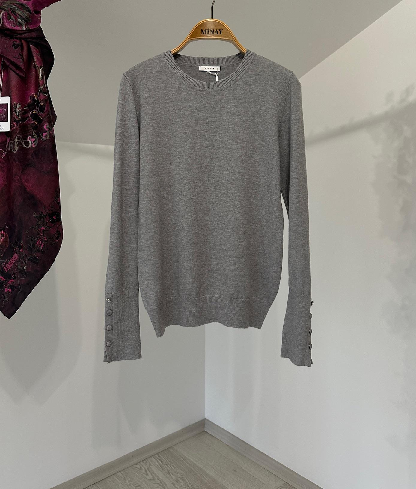 8008 Manşette Düğme Aksesuarlı Sıfır Yaka Triko Bluz-Gri