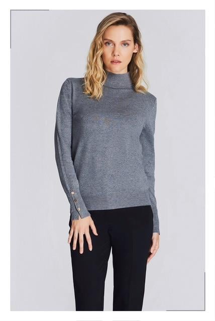 8014 Manşeti Düğme Aksesuarlı Dik Yaka Triko Bluz-Gri
