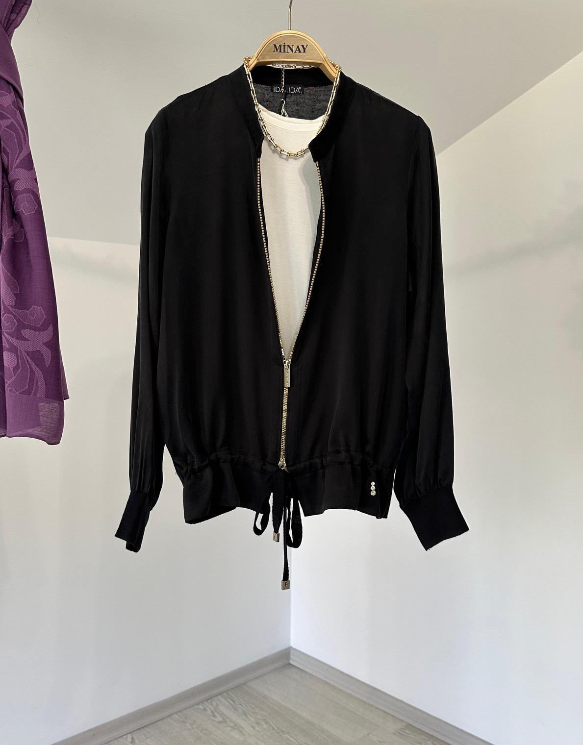 8200 Arkası Triko Önü Cupro Önden Fermuarlı Ceket-Siyah