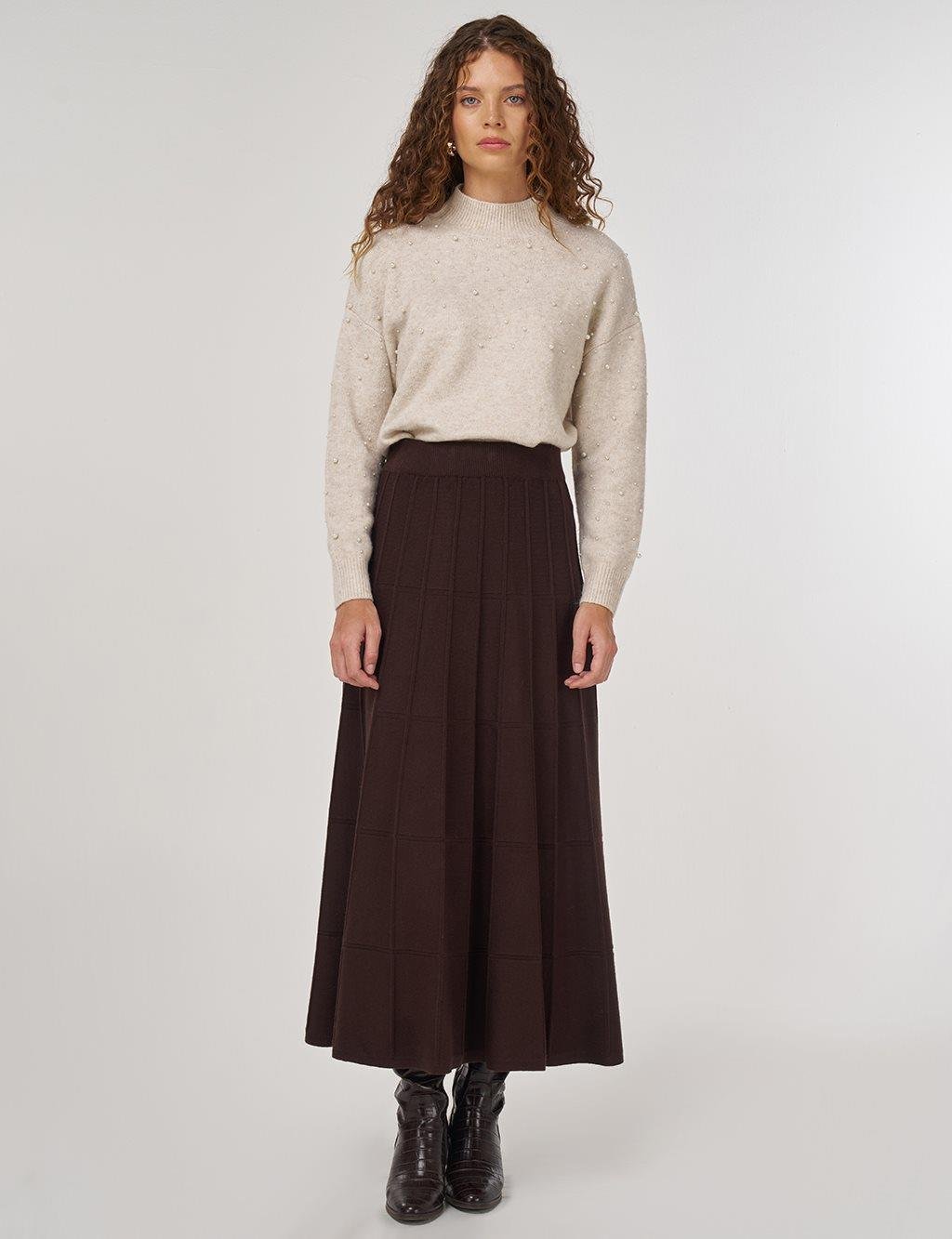 TRK146 Dikiş Detaylı Triko Etek-Kahve