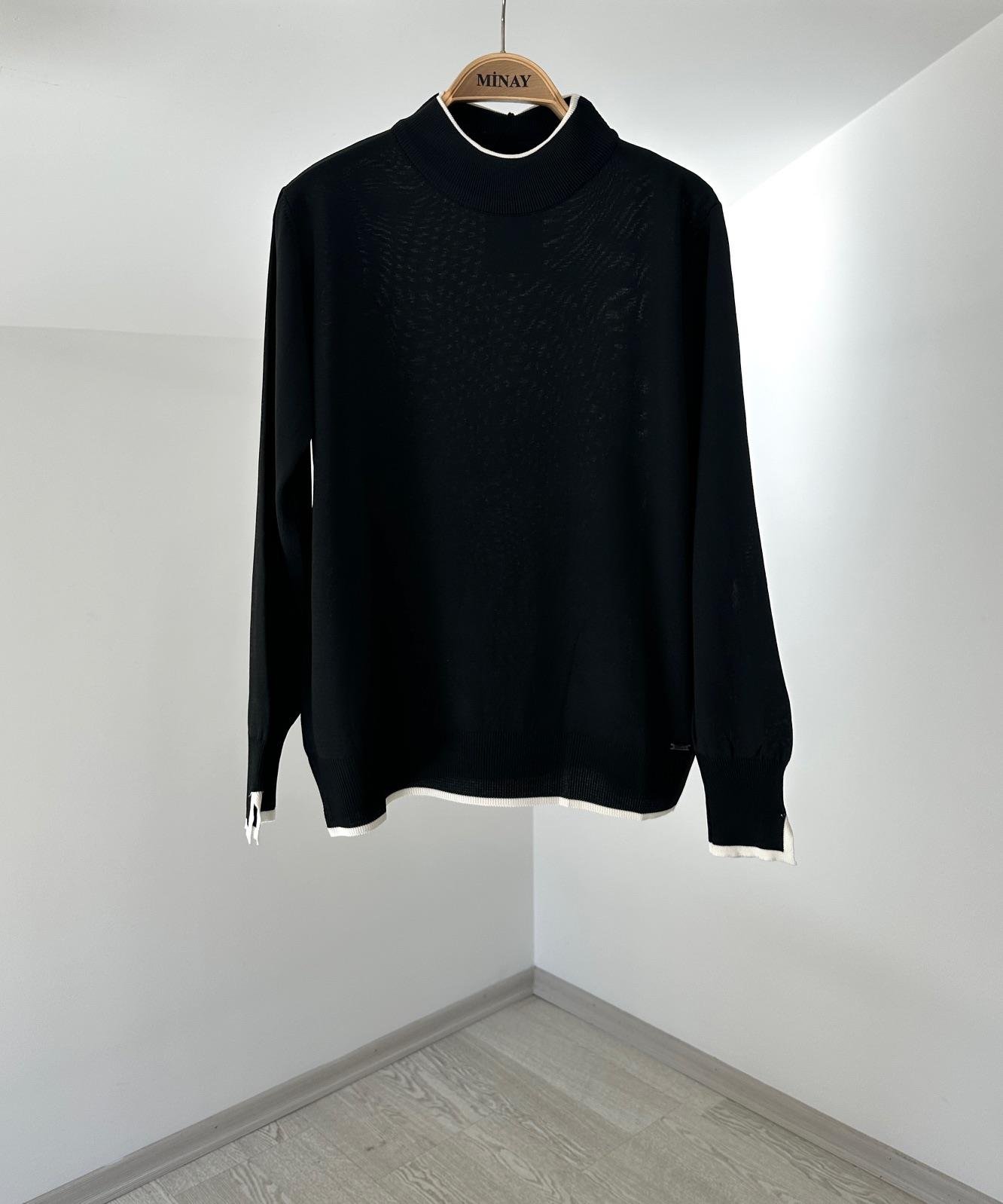 trk15 Kontrast Biye Detaylı Dik Yaka Triko Bluz-Siyah